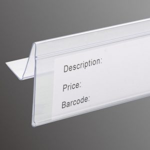 Flat design stays low-key. Fits standard shelf fronts; clear plastic makes tags easy to read.
